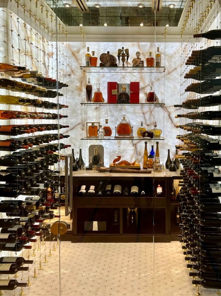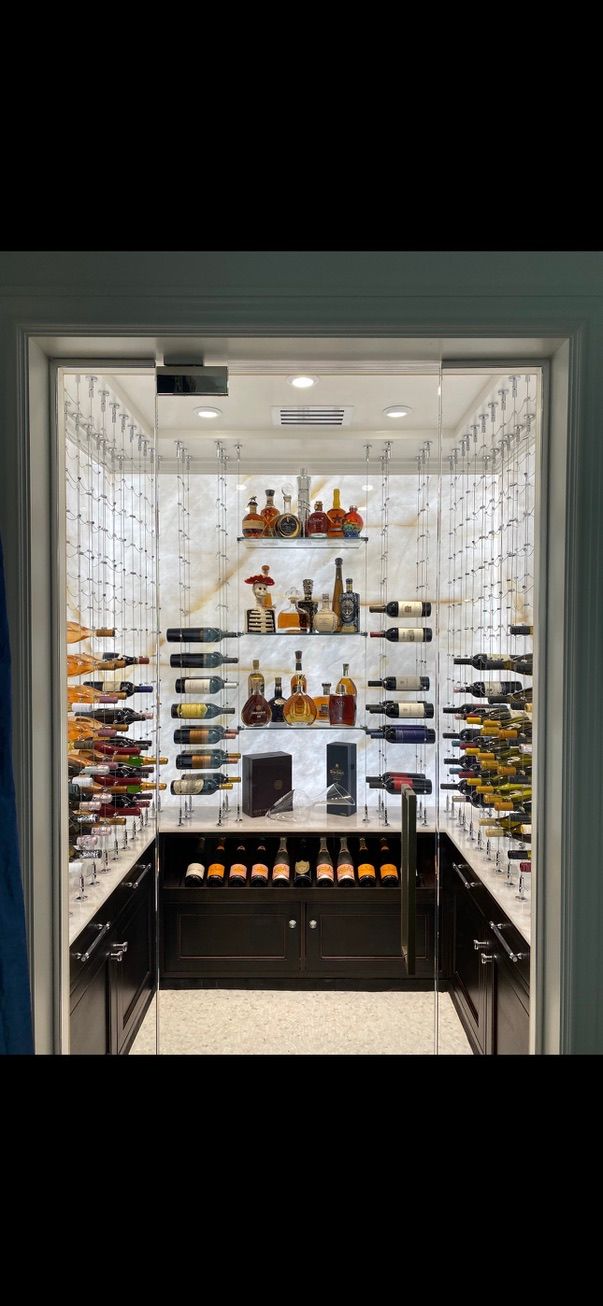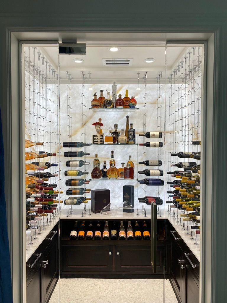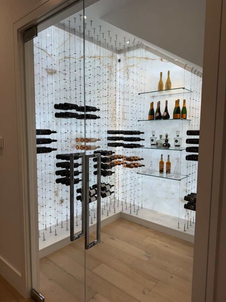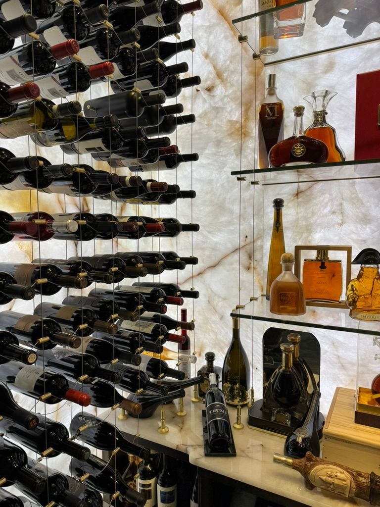 Backlit Cristallo slabs, Cable System, Floor-to-Ceiling Racking, Designed for discerning clients.